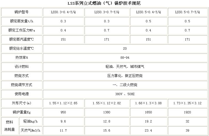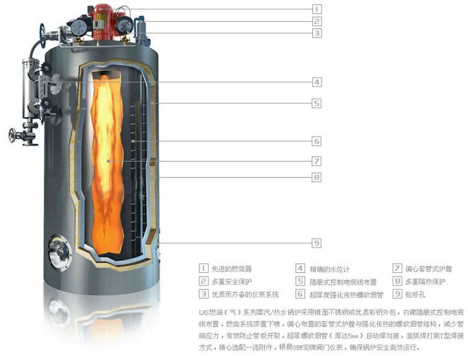 LSS型燃油(气)锅炉为立式快装内燃弯水管锅炉。燃料由外界气源进入燃烧器通过自动调节、自动点火功能产生高温火焰,由炉胆顶部进入炉胆内的密排水管内侧,在炉胆下部向折180°进入炉胆与密排水管的夹层间,然后由炉胆下部烟道口折180°进入筒体与包装层之间的肋片层,烟气在肋片间传热后由上部烟道口离开锅炉到囱排入大气。锅炉配置技术性能良好燃烧器,采用了燃烧自动比例调节,给水自动调节,程序启停,全自动运行等先进技术,并具有高低水位报警和极低水位、超高汽压、熄火等自动保护功能。该型锅炉具有结构紧凑、安全可靠、操作简便、安装迅速、污染少、噪音低、效率高等特点。